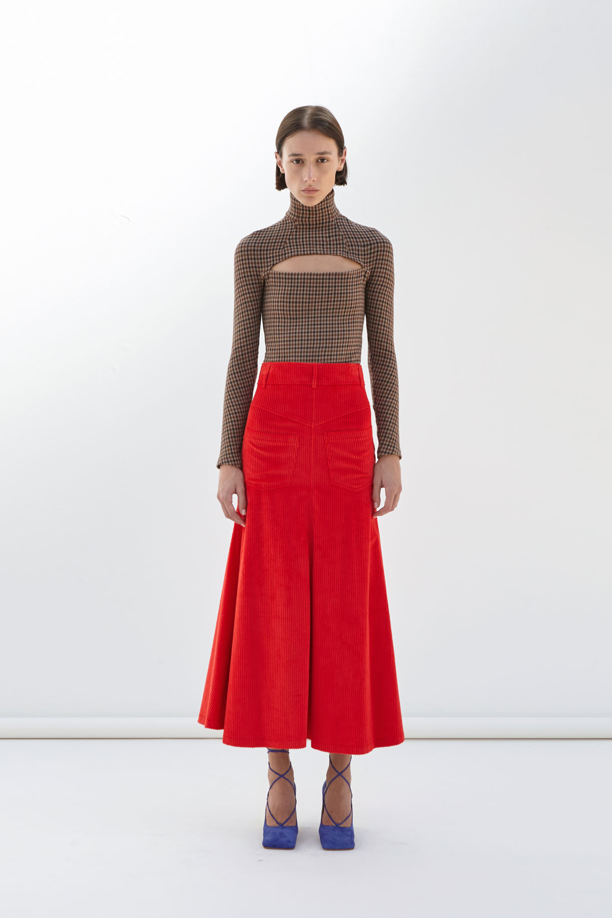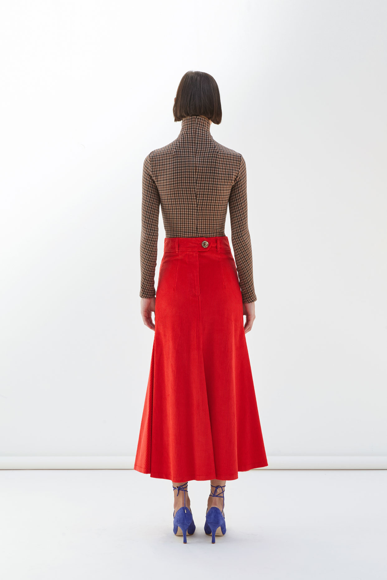 High-waisted trumpet corduroy midi skirt with yoke detail and back pockets in front. Worn here with Gingham mailbox top.