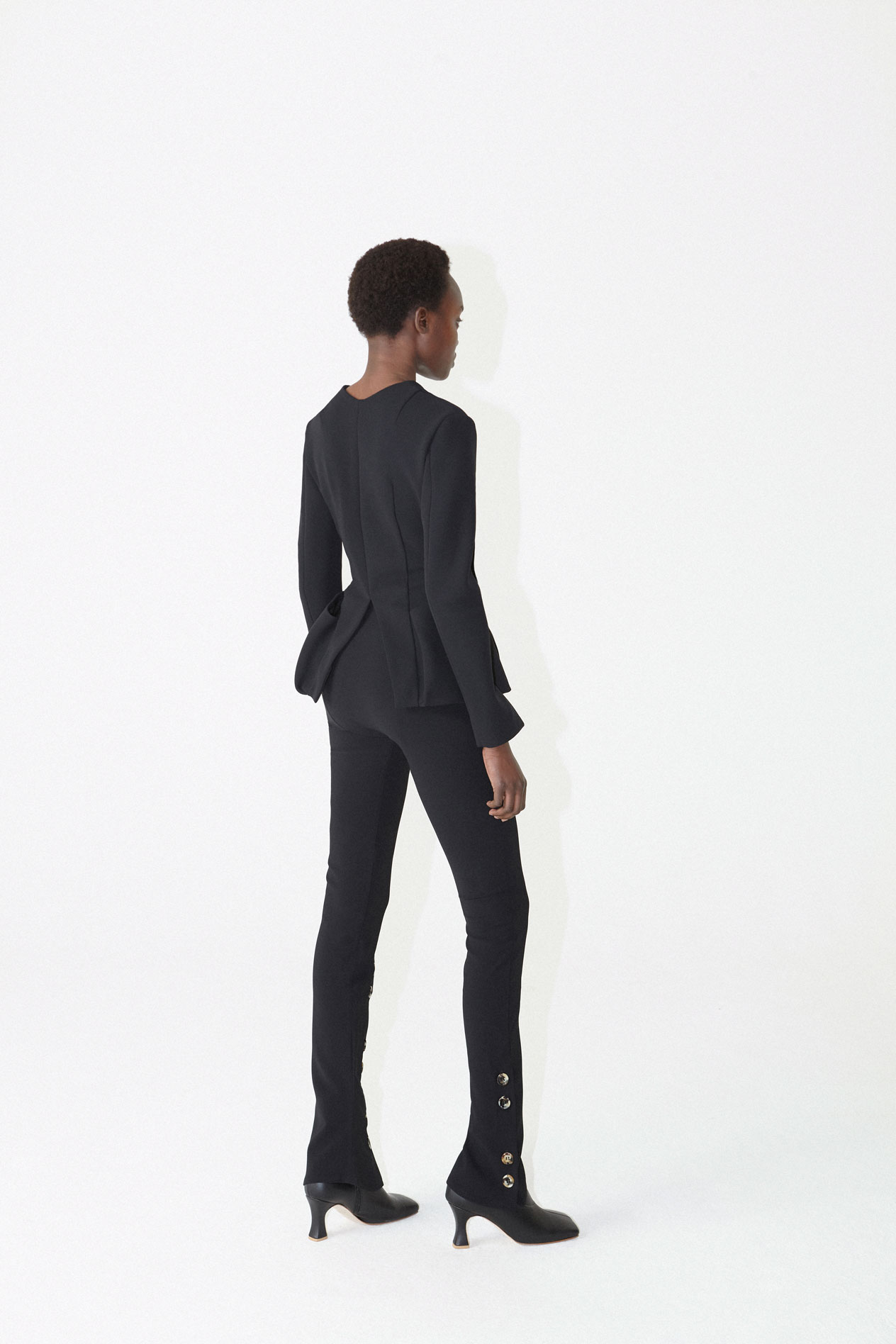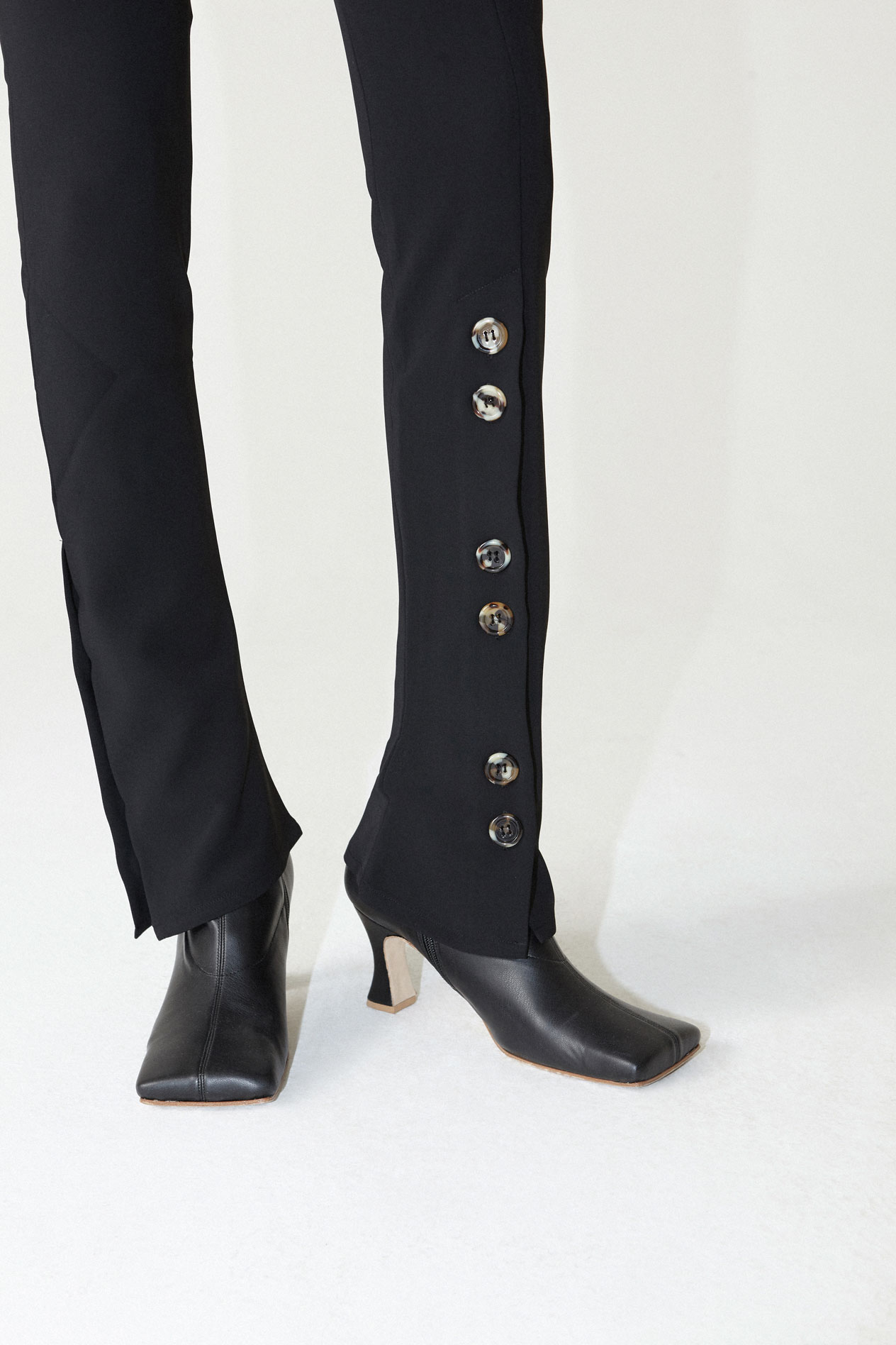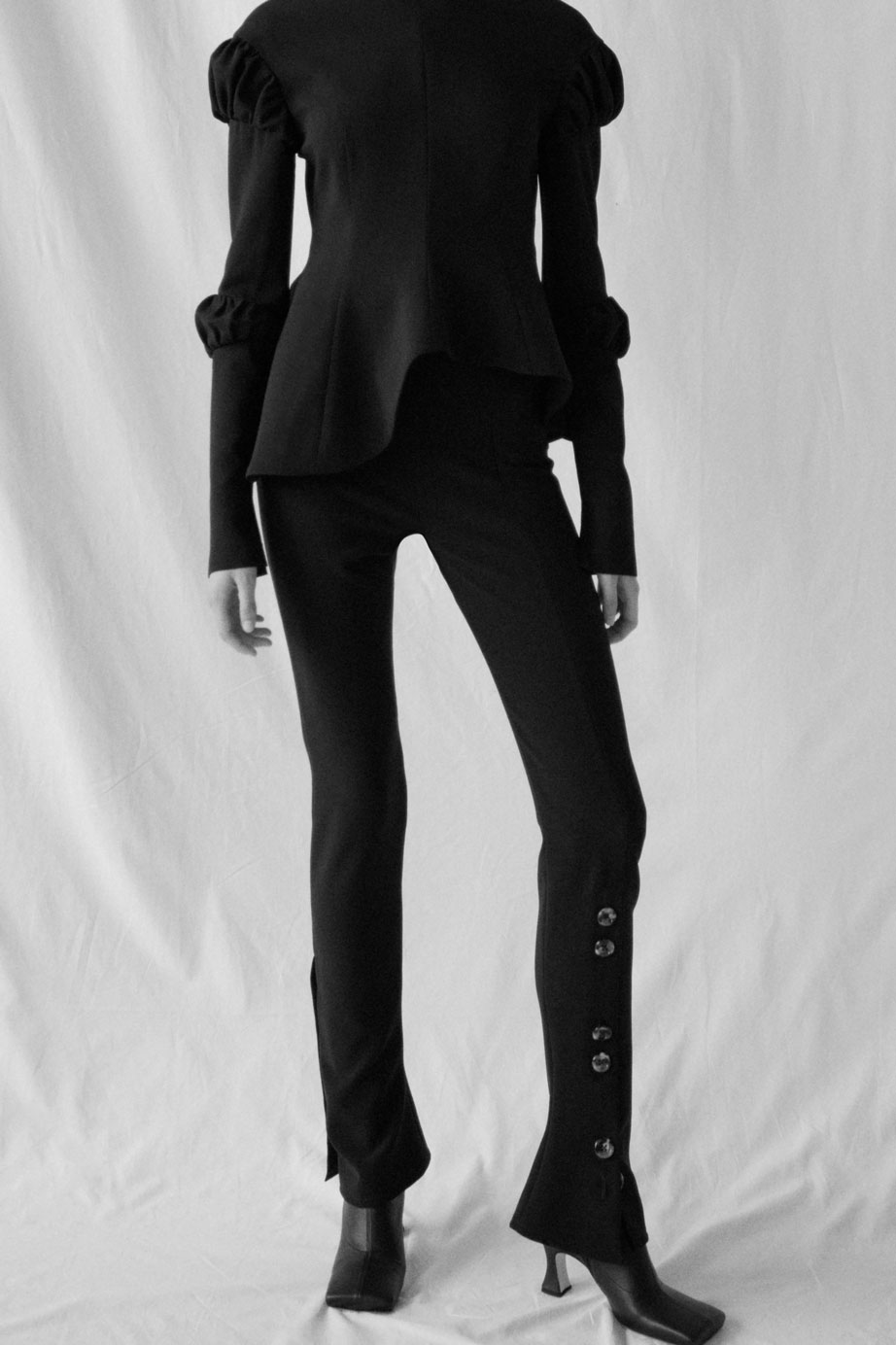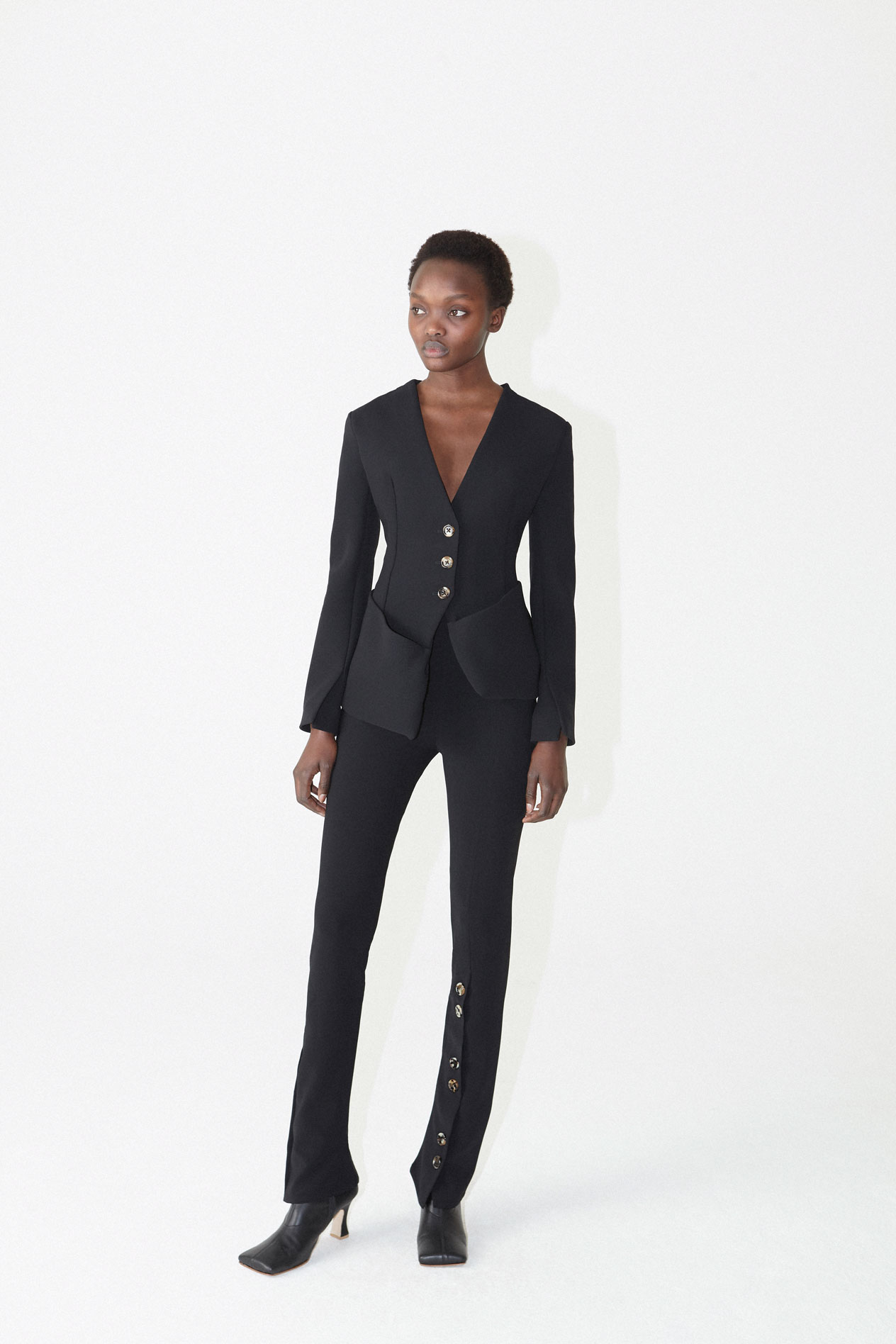 Fitted Pants With Side And Frontal Slits. Worn here with Fitted jacket with asymmetric oversize pockets and Priscilla Boots.