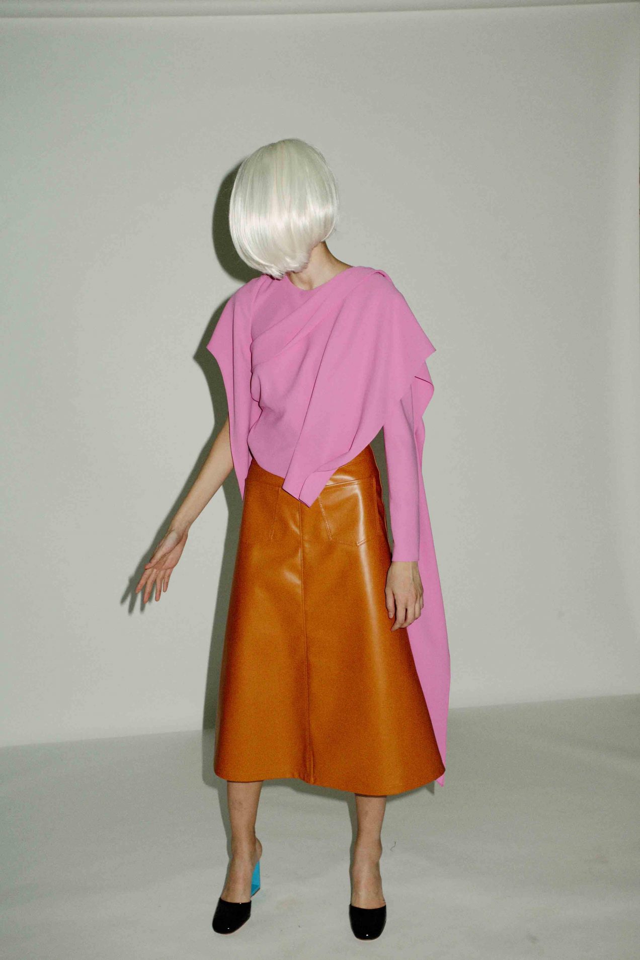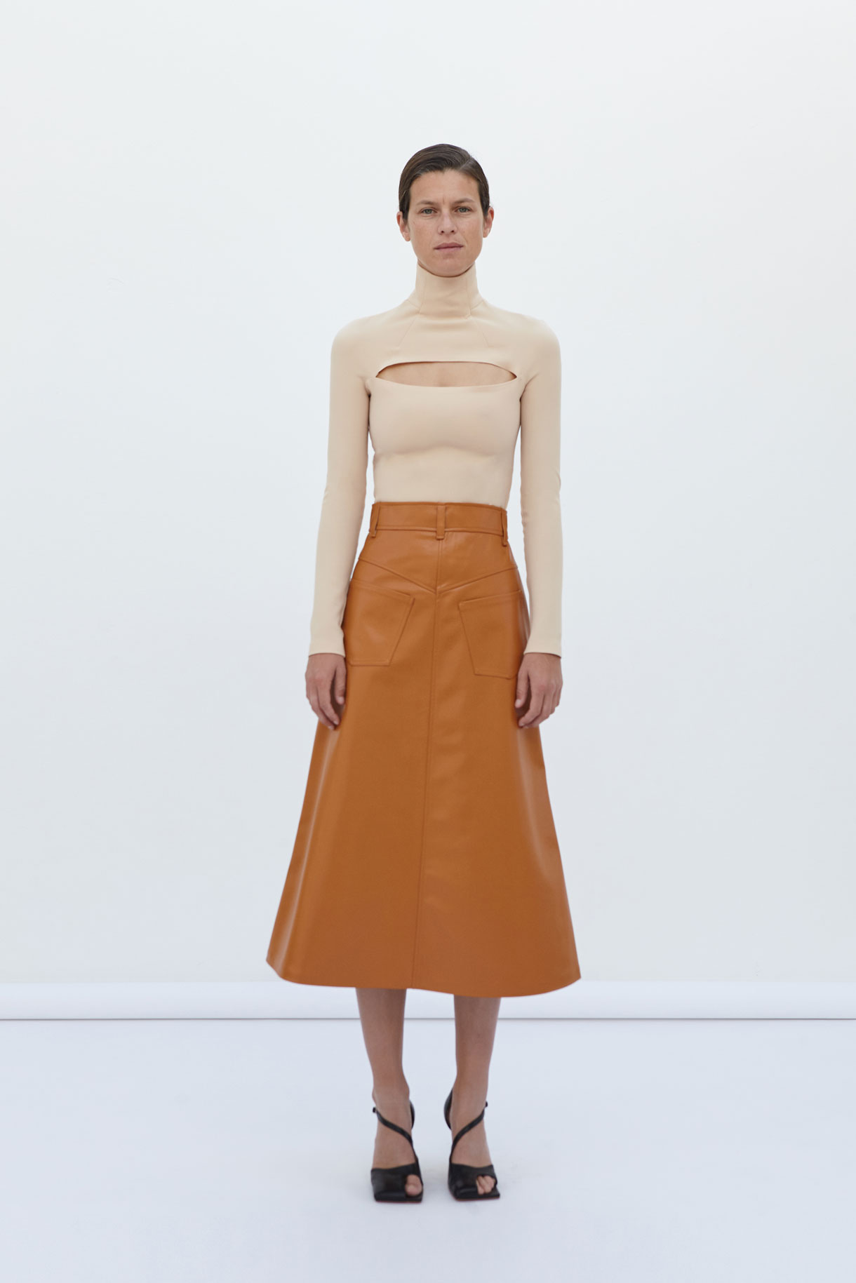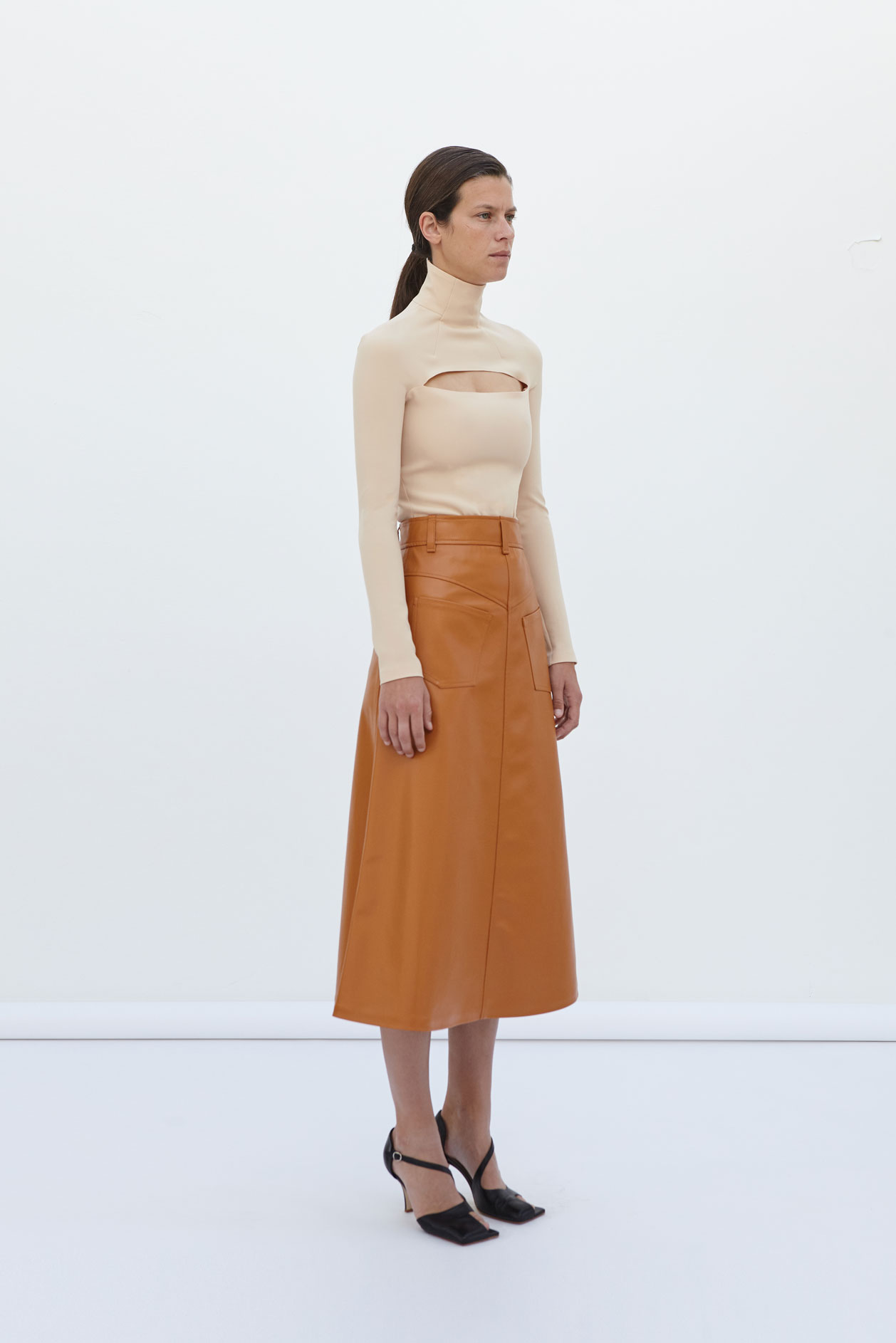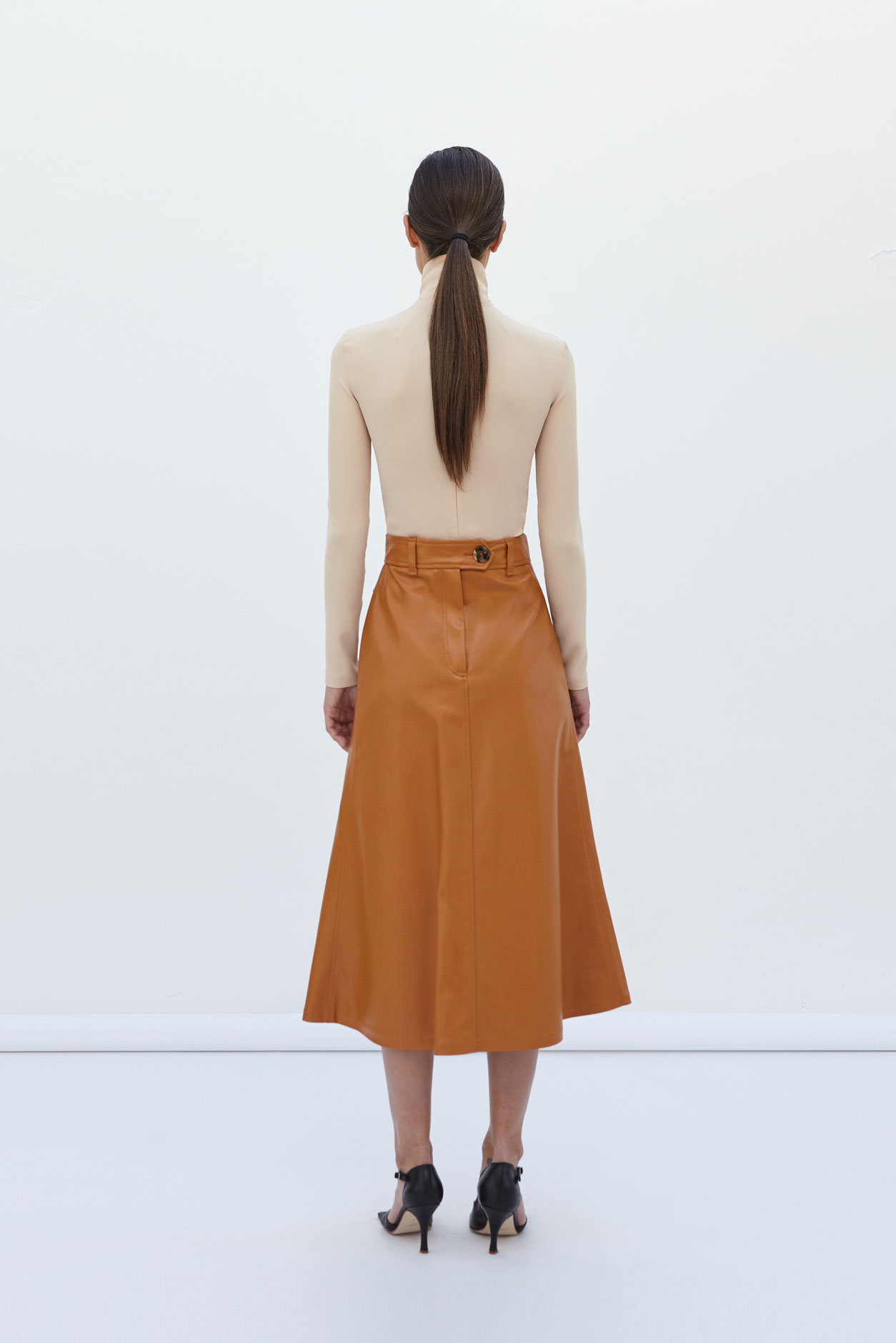 High-waisted back to front kick flare skirt with yoke detail and back pockets in front. Worn here with Mailbox Top and Asymmetric Mary Pumps.
