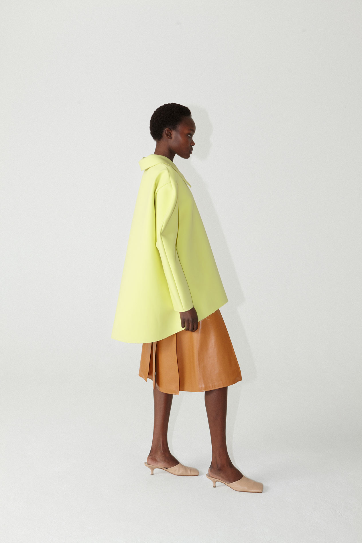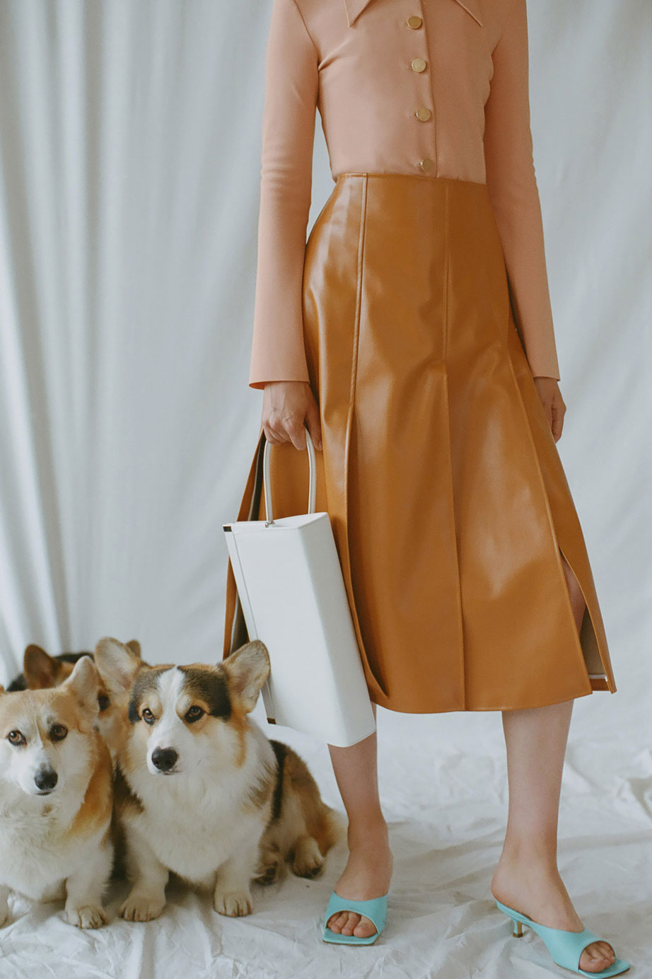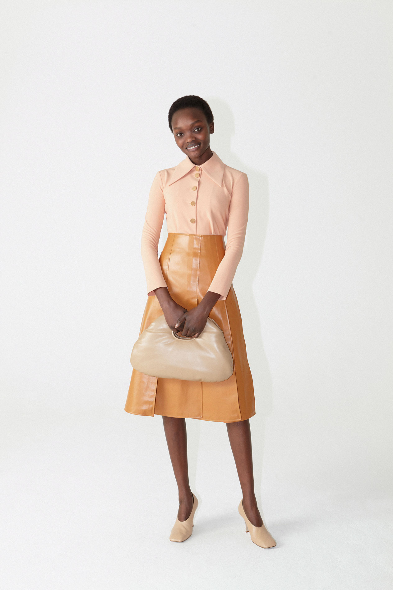 Faux leather multi-panel skirt. Worn here with Fitted Shirt, Small Lucy Bag and New Matilda Pumps.