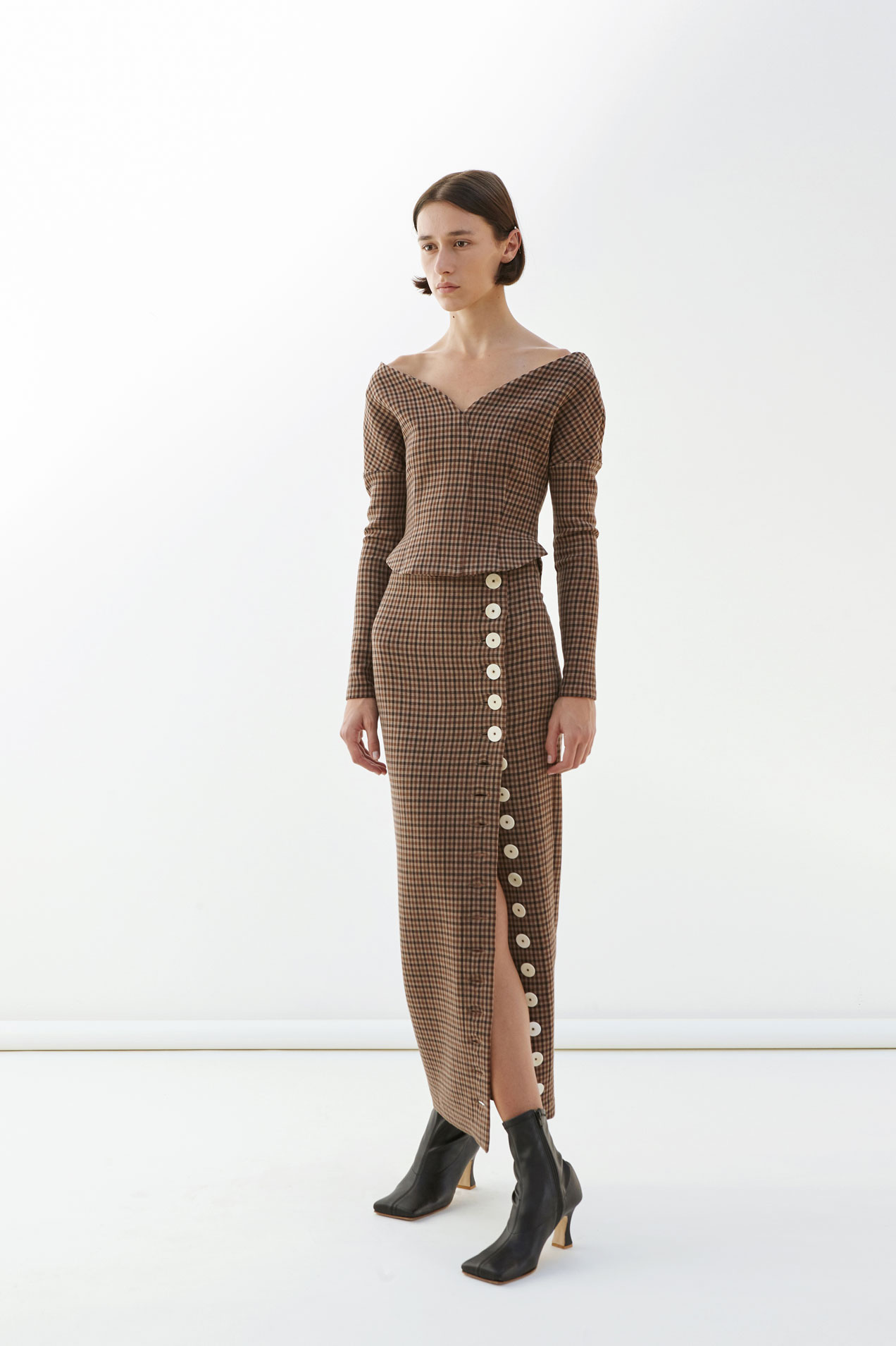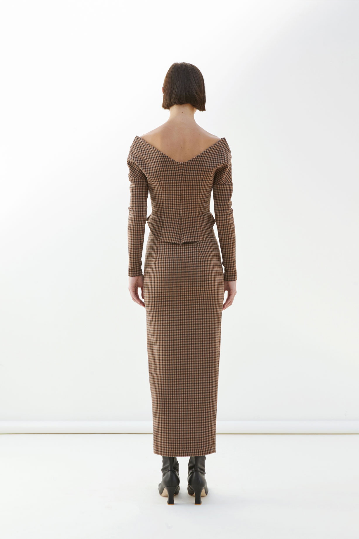 High waisted gingham maxi pencil skirt with frontal closure. Worn here with Kyoto Non Monroe top.