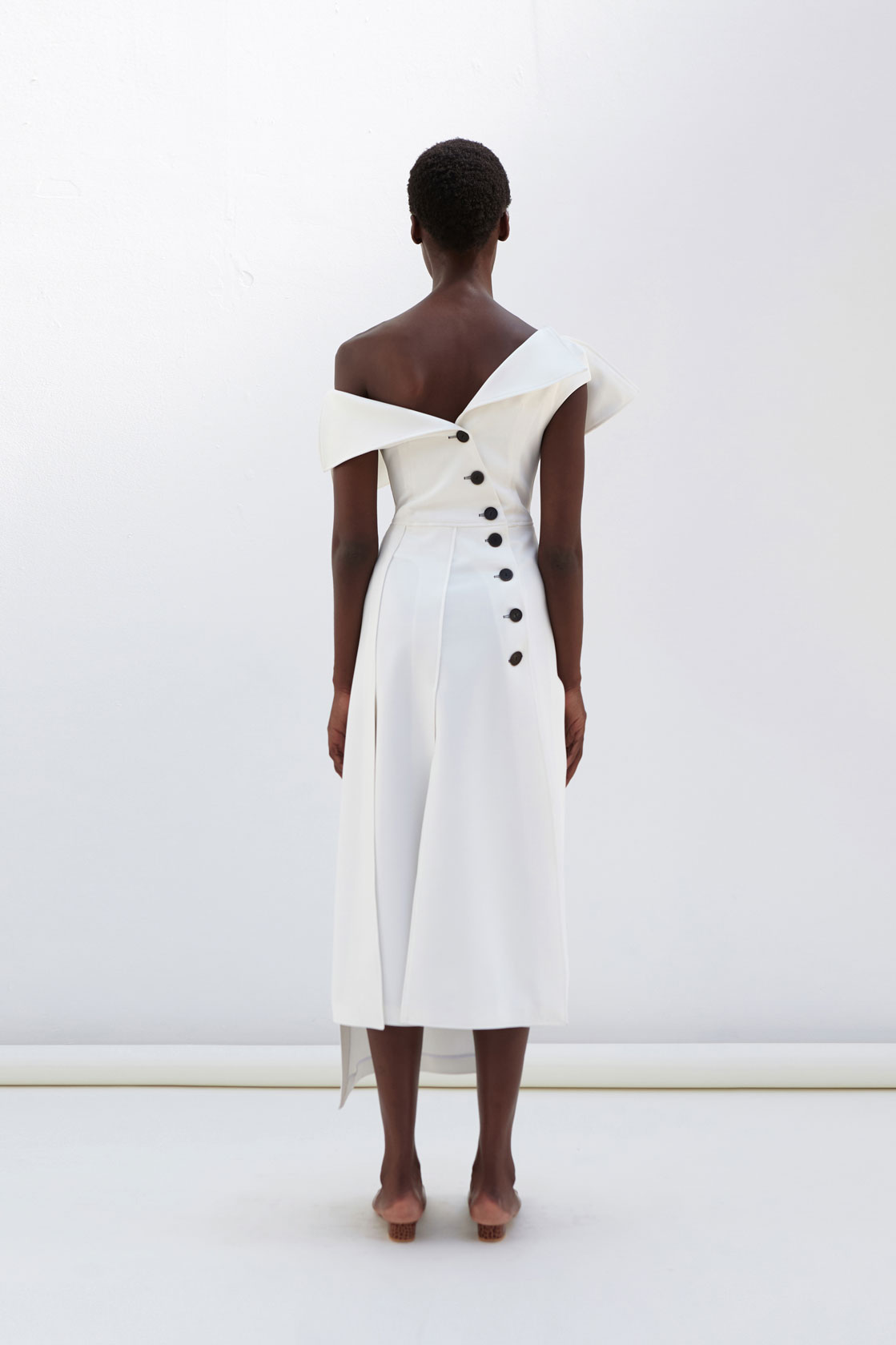 Midi dress with multi-panel bottom and button back closure. Worn here with Ken Mules.