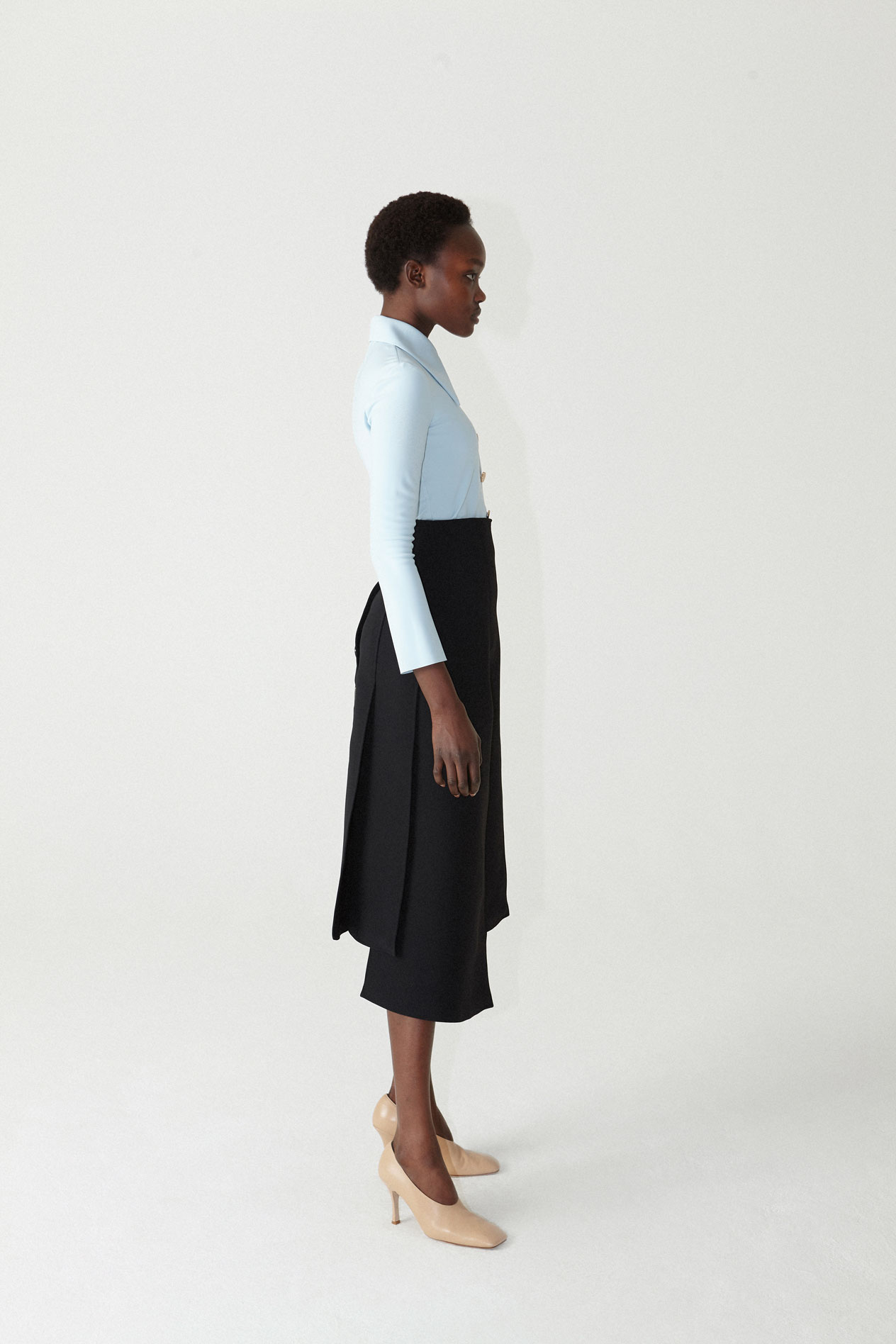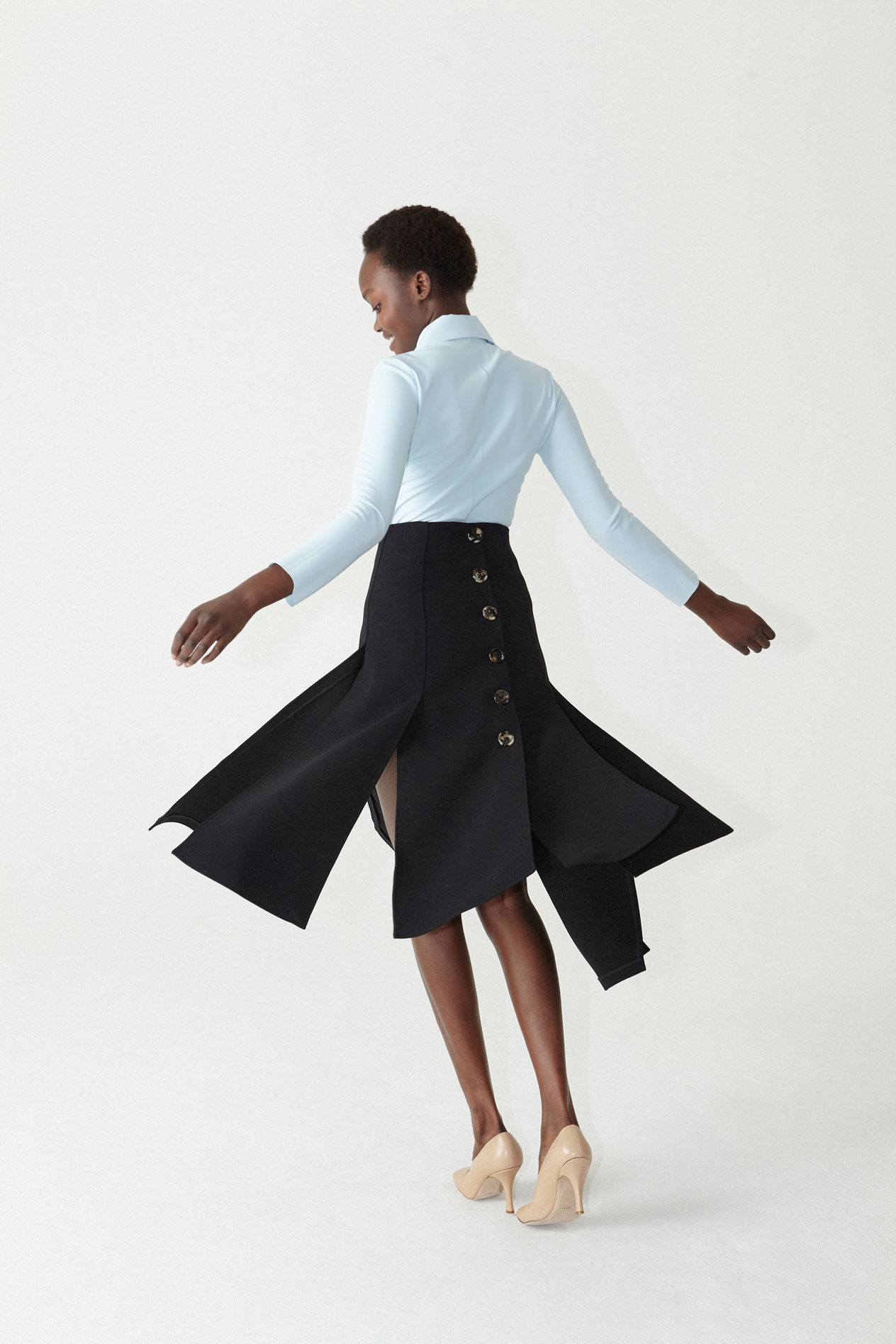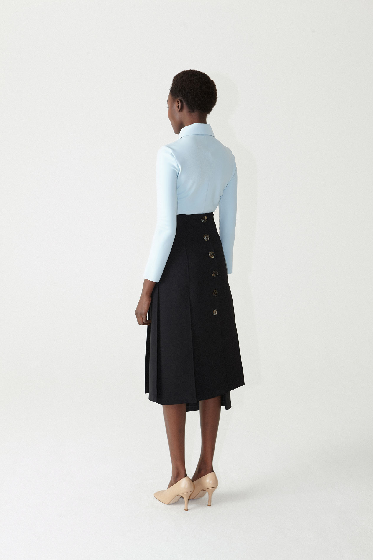 Multi-panel high waisted skirt with asymmetric detail and button closure. Can be worn back-to-front.