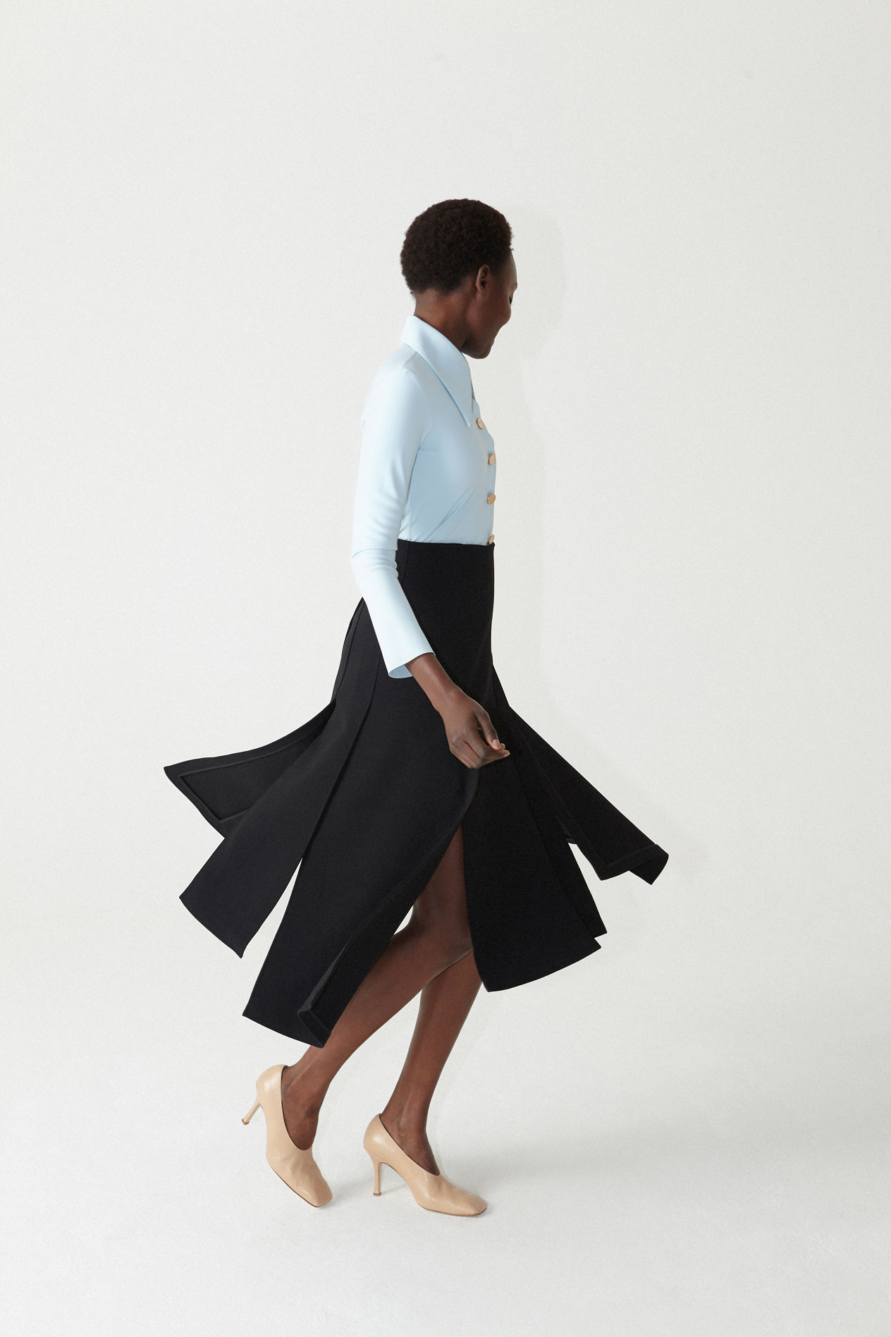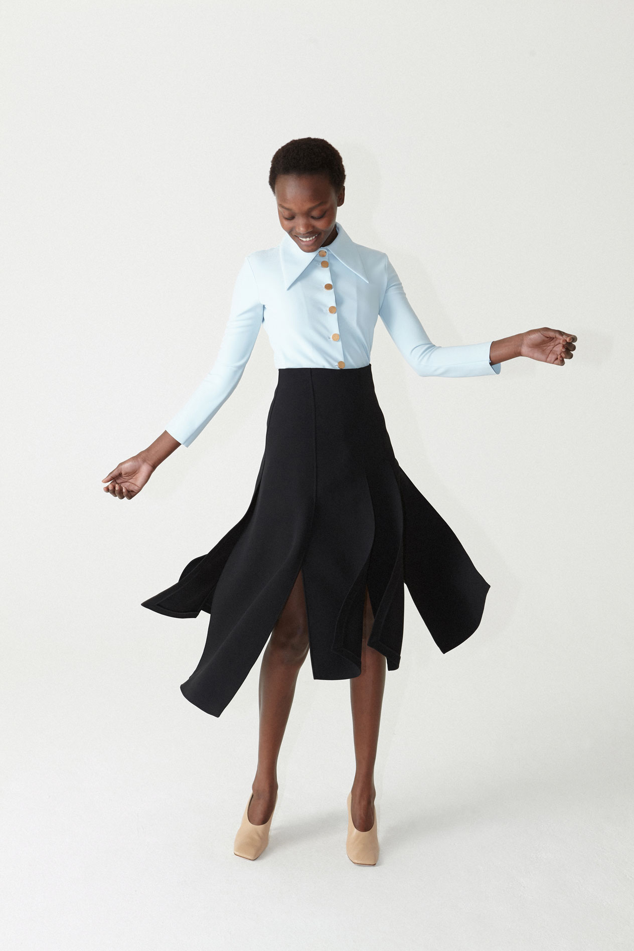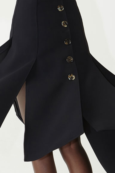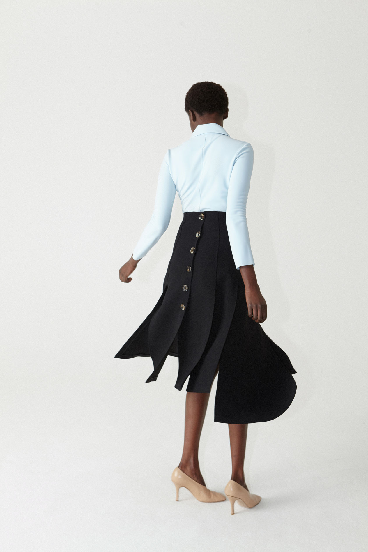 Multi-panel high waisted skirt with asymmetric detail and button closure. Can be worn back-to-front.