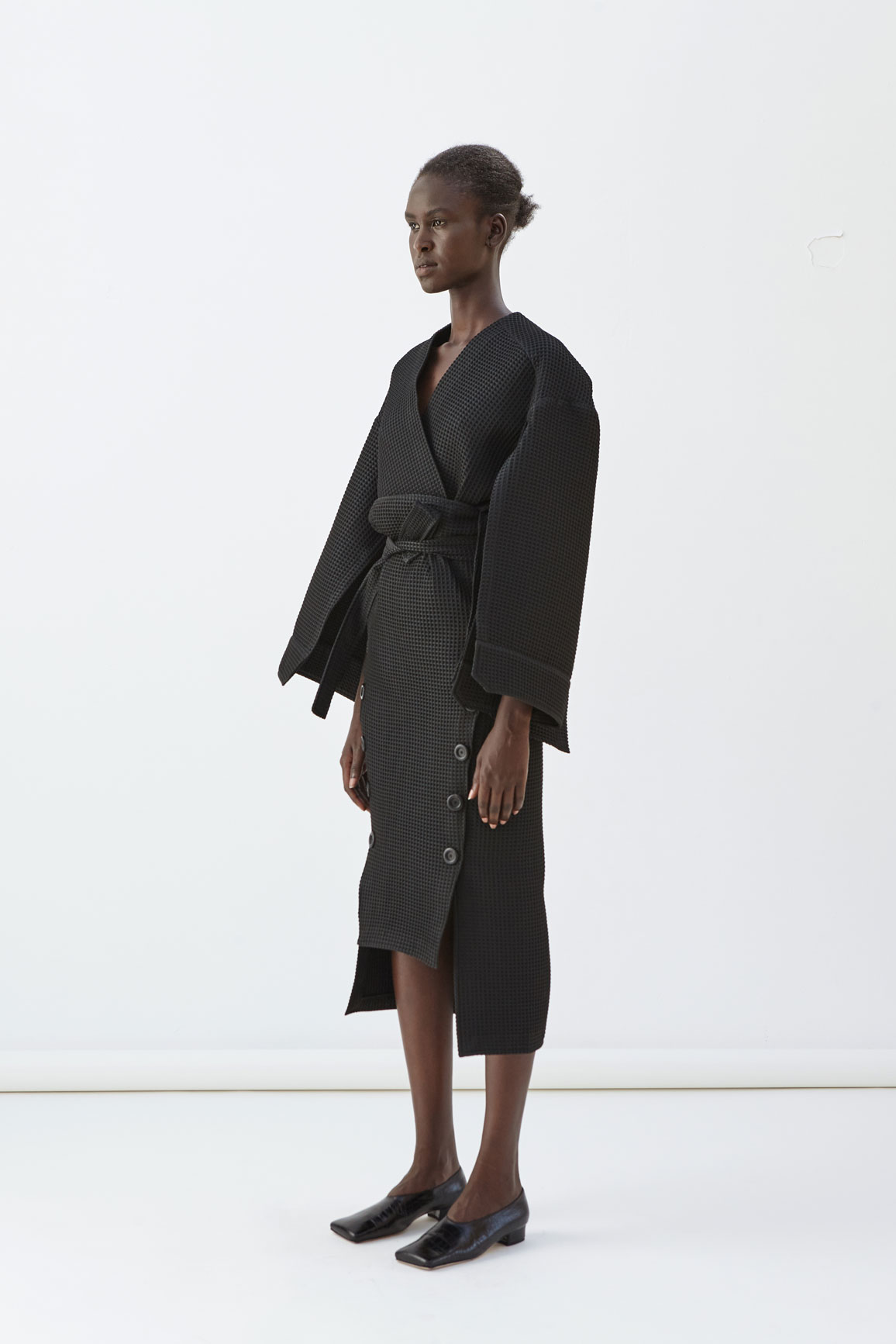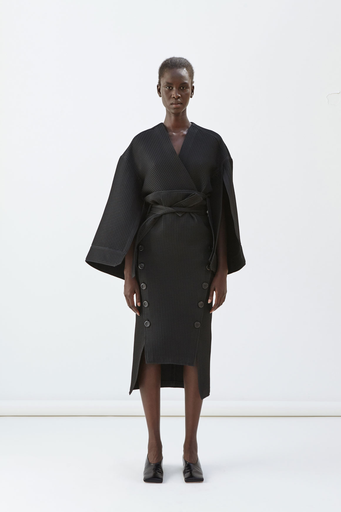 Waffle-like pencil skirt with belt and side button closure. Worn here with Wear Me On The Back Top.